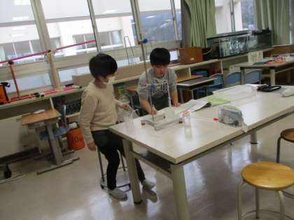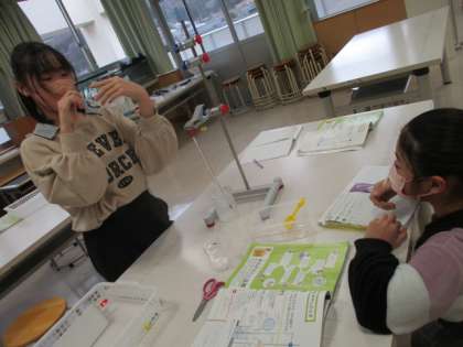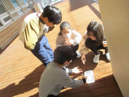 とても寒かった先日、ベランダにある入れ物の中の水が凍っていたのを見て、水が凍るのは温度と関係があるかもしれないと考えた4年生。今日の実験では、試験管を冷やし続けて、中の水が凍っていく様子を観察したり、実際の温度を記録したりしました。果たして4年生は水と氷と温度の関係について、どのように考えたでしょうか。