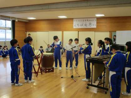 3年生代表の「能登の復活を祈って〜〜」という発声の後、まずは3年生みんなで祭りの即興表現をしました。和太鼓や笛は、一人が8拍分を即興で演奏し、どんどん交代していくのです。