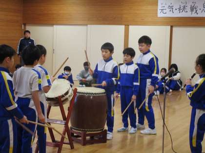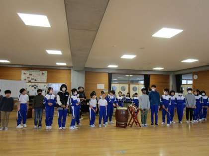 3年生のやり方を見て、次には全校児童も挑戦しました。なんの説明も練習もなかったのですが、即座に全員が和太鼓の即興表現をすることができました。