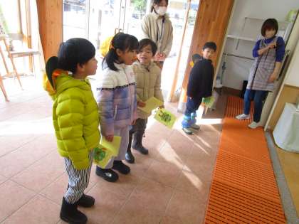 2月6日に、年長さんを招待し、「じんづうみどりへ ようこそしゅうかい」をします。その集会にきてもらうために、保育所に招待状を持って行きました。久しぶりの対面なので、最初は、お互いに緊張している様子も見受けられましたが、しばらくお話しするうちに満面の笑顔が見られました。これから集会準備に入ります!