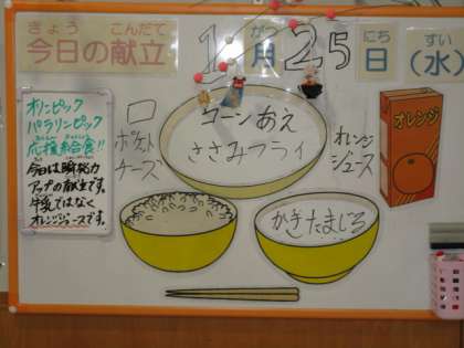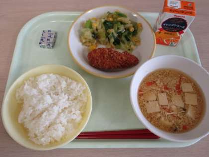 今日の献立は、ごはん、超回復オレンジジュース、ささみフライ、コーン和え、かきたま汁、ポケットチーズです。