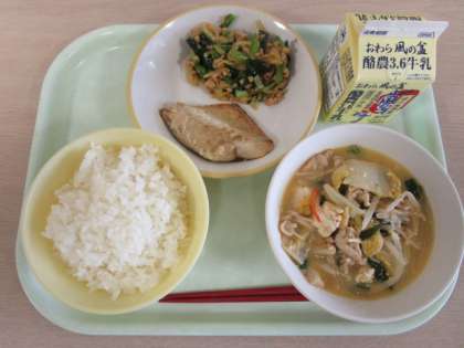 今日の献立は、ごはん、牛乳、さばの塩焼き、ねばーる納豆和え、全集中ごまキムチ鍋です。