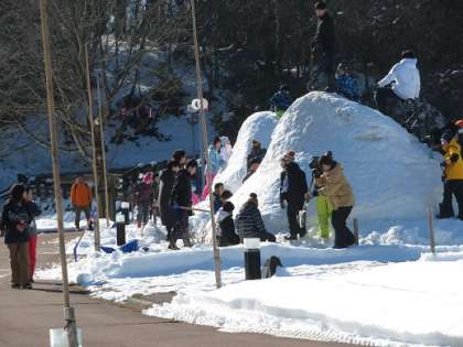 雪像をつくるに当たって、デザイン案を小学生が考え、赤・朱雀団は「オラフ」を白・白虎団は「ドラえもん」をつくることにしました。中学生が小学生を見守り、優しく声かけをしながら、大きな雪山を思い描く形に削っていきます。