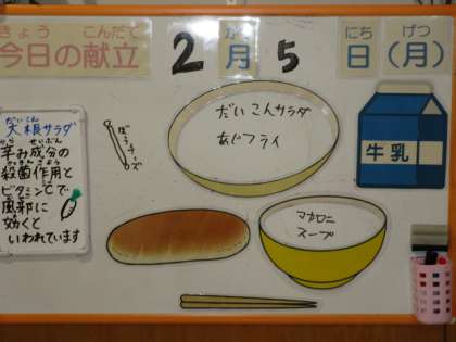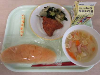 今日の献立は、コッペパン、牛乳、あじフライ、大根サラダ、マカロニスープ、棒チーズです。