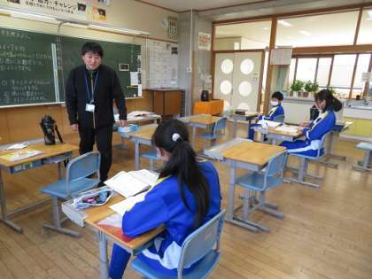 算数では、小数の筆算を学習している四年生。学んだことを使って問題を解く様子を担任が温かく見守っています。