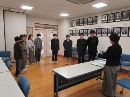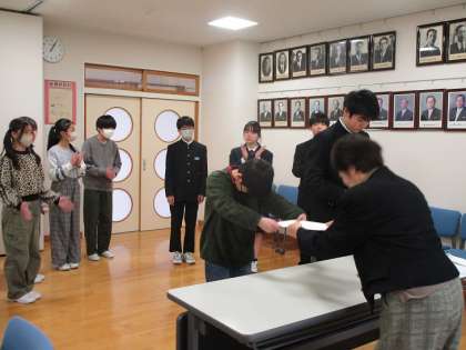 本日、楡原中学校生徒会と一緒に、富山ユネスコ協会の方へ集めた書き損じはがきを渡しました。はがきは、小学校100枚、中学校382枚となり、約28人が学校に通うことができるようになるそうです。