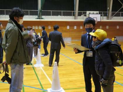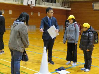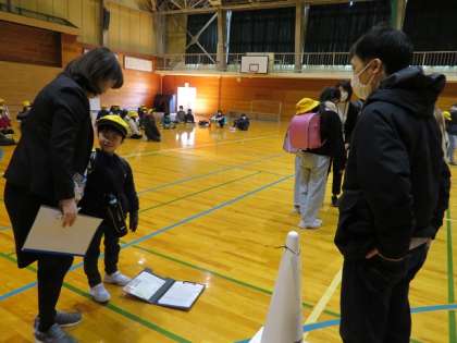 子供たちは、家族の方が体育館に来るまで静かに待っていました。保護者が迎えに来たら、担任の確認後、確実に引き渡しを終えました。