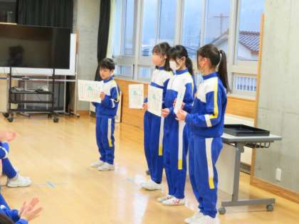 伝達受賞では、2月12日に行われた富山県小・中・高校生書初大会に本校の代表として参加した4名の子供たちが受賞しました。