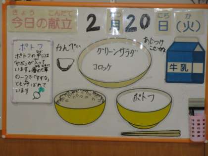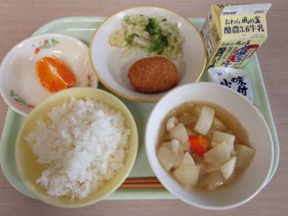 今日の献立は、ごはん、牛乳、コロッケ、グリーンサラダ、ポトフ、甘平、味付け小魚です。