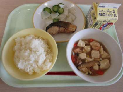 今日の献立は、ごはん、牛乳、ふくらぎの西京焼き、かぶのサラダ、えびと豆腐のうま煮です。