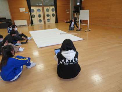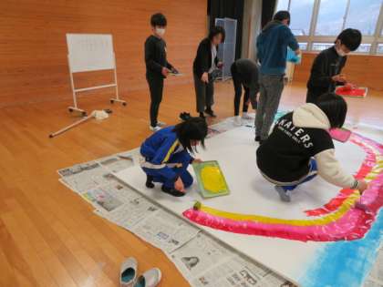 子供たちとの話合いの結果、書く文字は「我逢人」「希望」「挑戦」の3つに決定しました。どれも子供たちが提案した言葉です。背景も子供たちが決め、早速描き始めました。