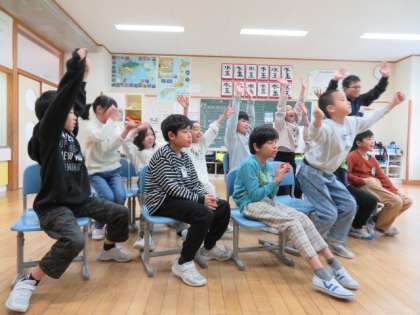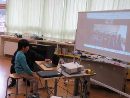 質問タイムでは、お互いに知りたいことを質問し合いました。「全校児童の人数は?」「学校の近くに現れる動物はいますか?」など、自分の関心事を意欲的に言ったり聞いたりしました。オンライン交流を終えるときは、画面に向かって手を振り、笑顔で終了しました。