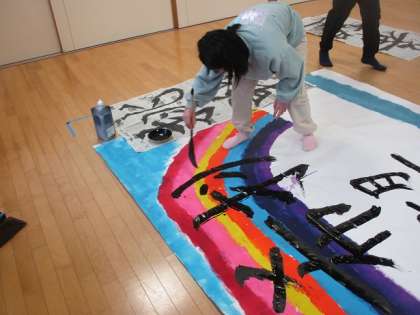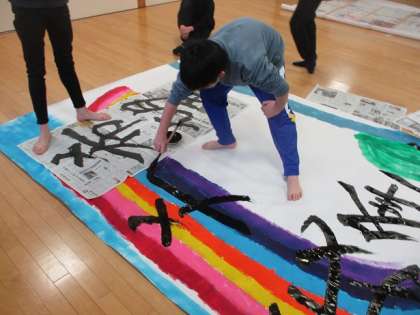 先日、子供たちは背景を描いたので、いよいよ三つの言葉を書き込みます。始めは、新聞紙で練習し、大まかな文字の大きさとバランスをつかみました。