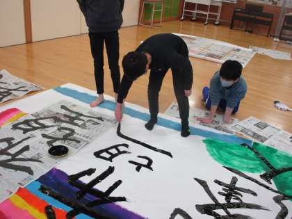 さて、本番。文字を書く本人だけでなく、仲間もじっと様子を見つめます。緊張しながらも見事に書き上げ、卒業制作の完成です。