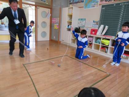 「校長先生、こま回し対決をお願いします。」という声が聞こえ、1年生教室でこま回し対決が始まりました。2年生のこま回し上達者にも声をかけ、2年生の子供たちが時間を計ったり合図をしたりしながら協力しました。