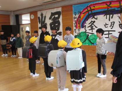 来週から一緒に登校する各地区のリーダーやバスリーダーと対面した1年生。リーダーは「安全に登校しましょう」「バスの運転手さんにあいさつをしましょう」などと、1年生に優しく声をかけていました。