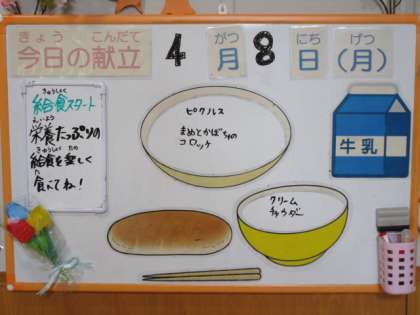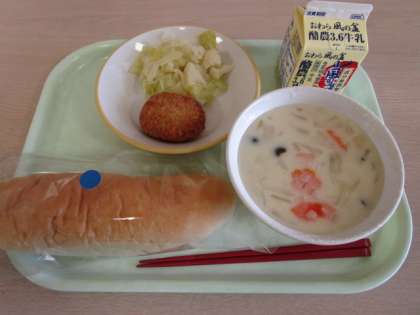 今日の献立は、コッペパン、牛乳、豆とかぼちゃのコロッケ、ピクルス、クリームチャウダーです。