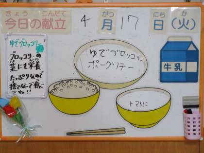 今日の献立は、ごはん、牛乳、ポークソテー、ゆでブロッコリー、トマト煮です。