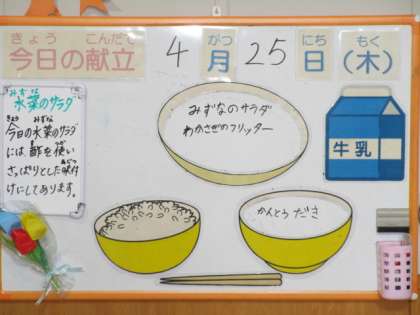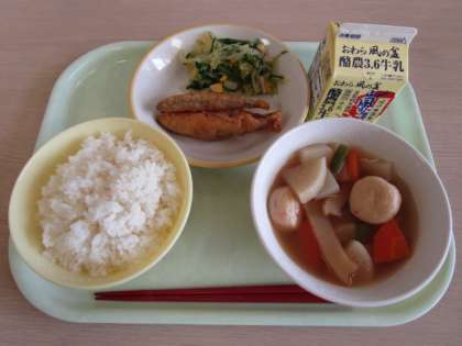 今日の献立は、ごはん、牛乳、わかさぎのフリッター、水菜のサラダ、関東だきです。