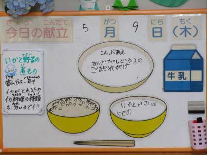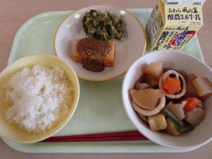 今日の献立は、ごはん、牛乳、揚げ出し豆腐のごまだれかけ、昆布和えです。