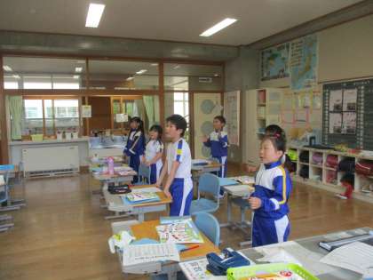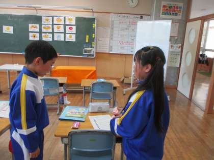 ALTの発音をまねしたり、歌を歌ったりして練習しました。その後、お互いに聞き合いました。体育の後、給食の前だったせいか、「I'm hot.」や「I'm hungry.」の人が多かったような気がしました。
