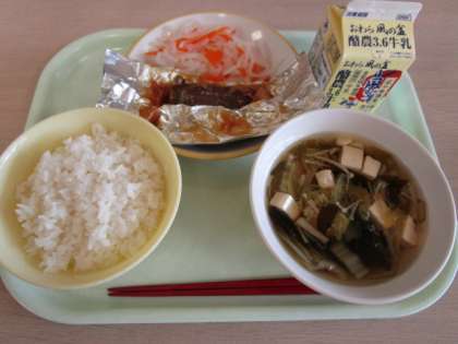 今日の献立は、ごはん、牛乳、さばの銀紙焼き、なます、すまし汁です。