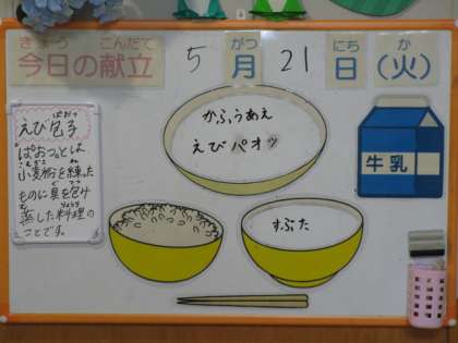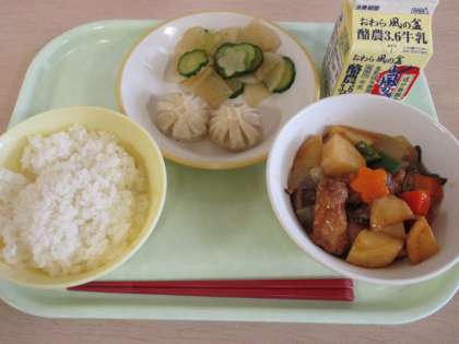 今日の献立は、ごはん、牛乳、えび包子、華風和え、酢豚です。