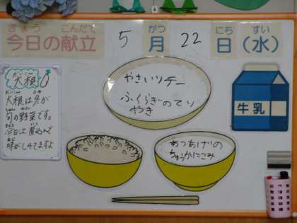 今日の献立は、ごはん、牛乳、ふくらぎの照り焼き、野菜ソテー、厚揚げの中華煮込みです。