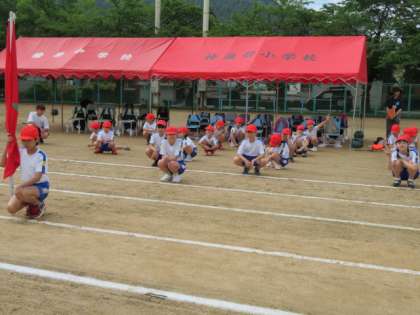 少し緊張した表情の子供たちは、開会式が始まるまで静かに整列して待っています。