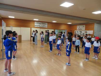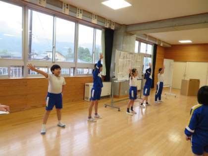 4年生がダンスを考え、全校児童の前で生き生きと踊ったり歌ったりしました。