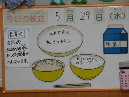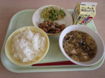 今日の献立は、ごはん、牛乳、あっさりチキン、あわせ和え、たまごともずくのスープです。