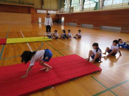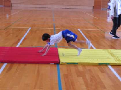 1・2年生の子供たちにとって、手に体重をかけた状態でタイミングよく足を動かすことは難しいですが、いろいろな動きを経験してほしいと思います。