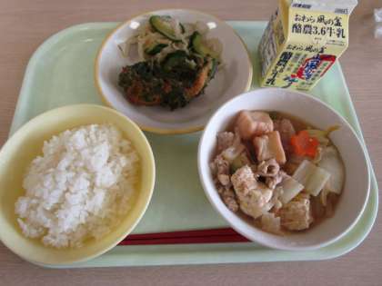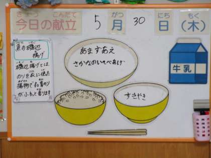 今日の献立は、ごはん、牛乳、魚の磯辺揚げ、甘酢和え、すきやきです。