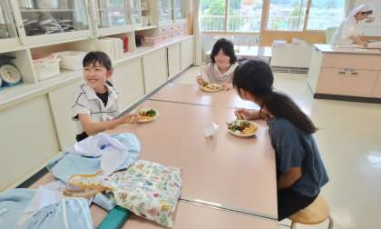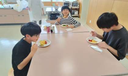 6年生の家庭科では、調理実習を行いました。自分たちのカフェのモーニングメニューを考えることをテーマに仕上げていました。子供たちが作ったスクランブルエッグ、ほうれん草とニンジンの和え物がとても美味しそうでした。