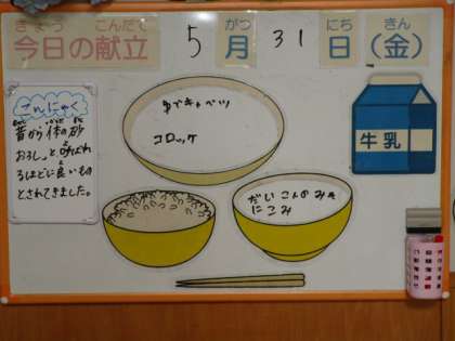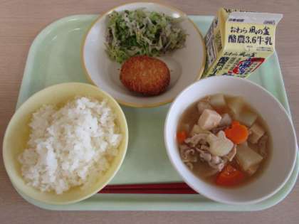 今日の献立は、ごはん、牛乳、コロッケ、ゆでキャベツ、大根のみそ煮込みです。