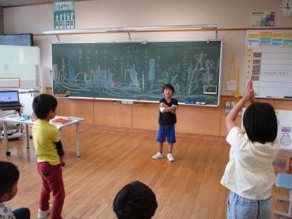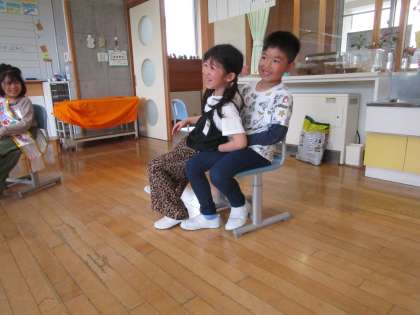 入学して初めてクラスでお楽しみ会をしました。「なんでもバスケット」というゲームでは、一つの椅子に二人が同時に座ってしまって大笑いしたり、のりのりでダンスをしてへとへとになったり、とても楽しい時間になりました。