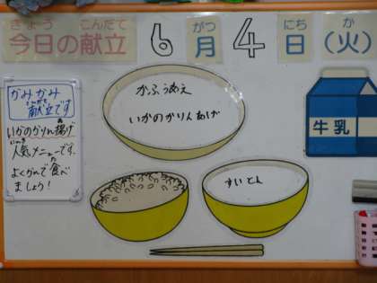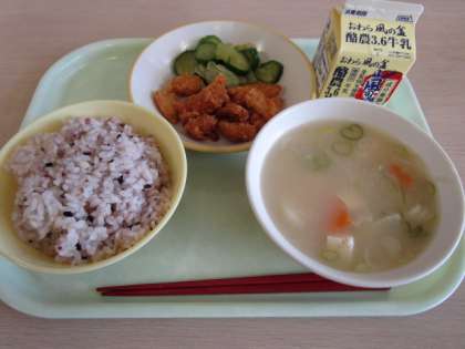 今日の献立は、雑穀入りごはん、牛乳、いかのかりん揚げ、華風和え、すいとんです。