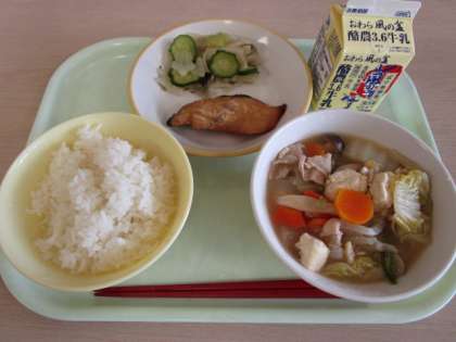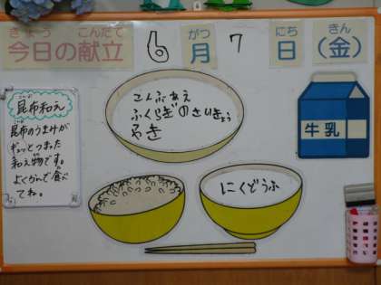 今日の献立は、ごはん、牛乳、ふくらぎの西京焼き、昆布和え、肉豆腐です。