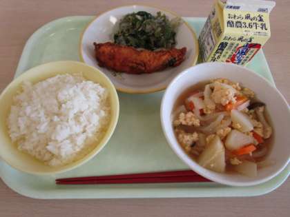 今日の献立は、ごはん、牛乳、魚の竜田揚げ、よごし、卵とじです。