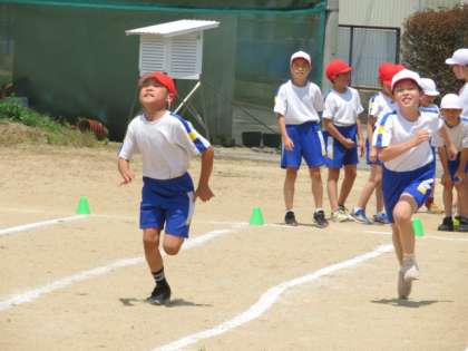 50m走で、ゴールに向かって懸命に走る4年生です。