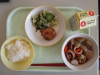 今日の献立は、ごはん、牛乳、肉シューマイ、しょうがひたし、とんこつラーメン、大豆ふりかけです。