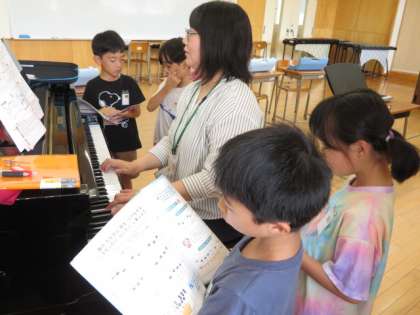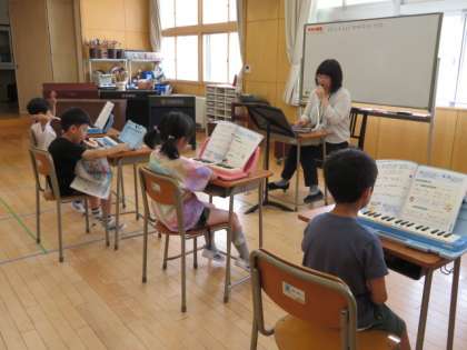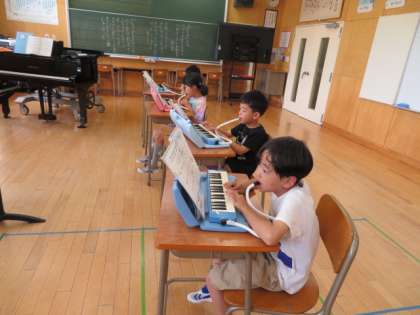 鍵盤ハーモニカの演奏では、指使いを確認して一生懸命演奏している子供たちの様子が見られました。