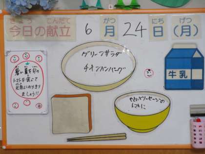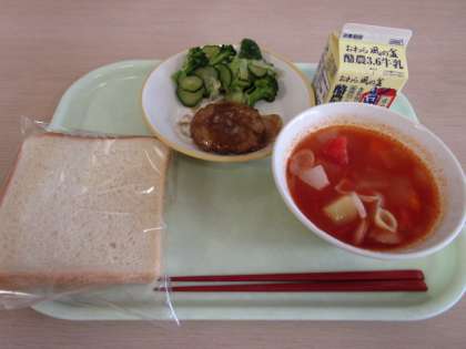 今日の献立は、食パン、牛乳、チキンハンバーグ、グリーンサラダ、野菜とソーセージのトマト煮です。