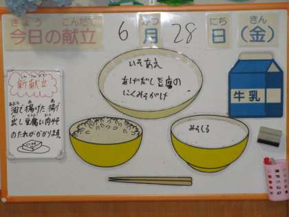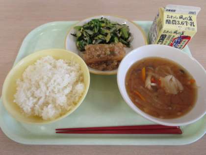 今日の献立は、ごはん、牛乳、揚げ出し豆腐の肉みそかけ、磯和え、みそ汁です。