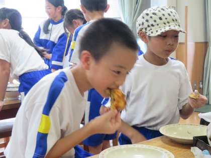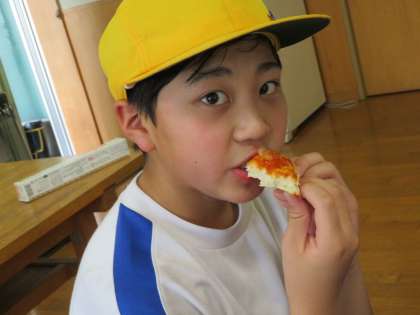 トッピングしたピザをかまどで焼き上げ、上手にピザができあがりました。子供たちは、とてもおいしそうに頬張っていました。