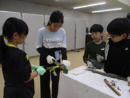 食堂での昼食を終え、午後からマイスプーン作りを行いました。グリーンアドベンチャーの際、天湖森で拾った枝をのこぎりで切って好みの長さに調節したり、電動ドリルで穴を開けたりする作業を行いました。持ち手の枝部分は紙やすりで丁寧に仕上げ、自分のオリジナルスプーンを作って満足そうな様子でした。