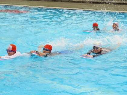 アザラシチームの子供たちは、ビート板を使って息継ぎやキックをスムーズに行って、泳ぐ距離を伸ばせるようにがんばっています。
