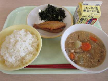 今日の献立は、ごはん、牛乳、わかさぎのフリッター、ひじきのごま和え、冬瓜のそぼろあんです。