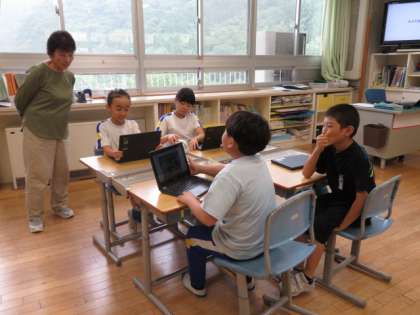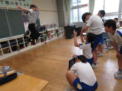 始めに担任の姿を写真に撮る課題が出されました。3つのグループの子供たちが、時間を決めて担任の写真を撮っていきます。最初は緊張していた子供たちも、温かな雰囲気の中、楽しそうに写真を撮っていきました。中には、担任にポーズの指定をしたり、高さを変えて写真を撮ったりと、その子なりのよさが見えてきました。