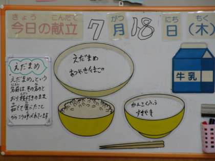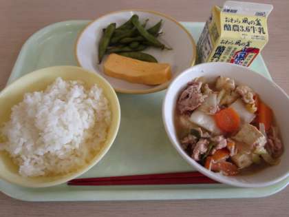 今日の献立は、ごはん、牛乳、厚焼き卵、枝豆、韓国風すきやきです。